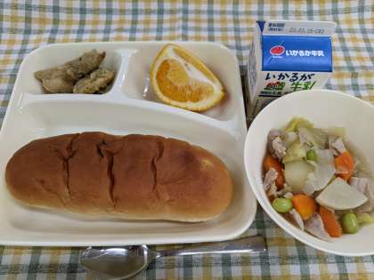 3月9日(木)のこんだては「鶏肉のカレー風味焼き、洋風煮、はっさく、おさつパン、牛乳」です。