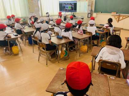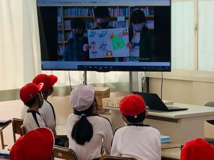 図書委員会が作成した、「サンちゃんが大切なたすきを落として困ってしまう」というお話の紙芝居を見ている様子です。