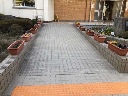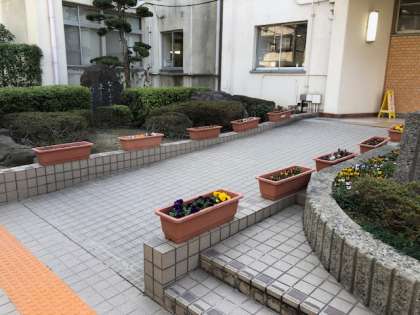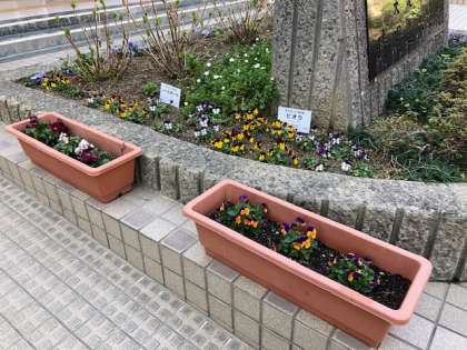 冬場は日当たりが悪いため、クスノキ広場で育成していたプランター(ビオラ・パンジー)を移動しました。