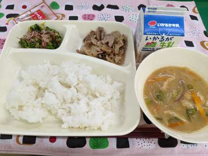 3月15日(水)のこんだては「豚肉のしょうが焼き、さつまいものみそ汁、なのはなのおひたし、ごはん、牛乳」です。
