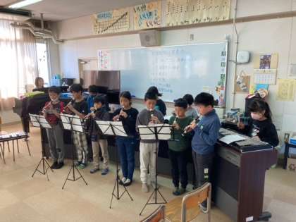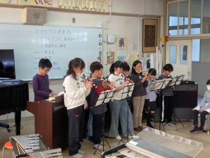 リコーダーの上パート、下パート、鉄琴、オルガンを合わせて演奏しました。綺麗な音を響かせていました。三年生になり音楽が好きになった子が増えまして、嬉しく思います。