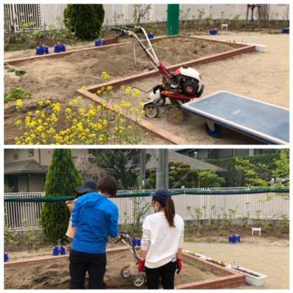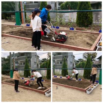 理科の授業で使う学習園、まずは土づくりからスタートです。雑草を抜いて耕運機をかけてます。簡単なようで意外と難しく力のいる作業です。