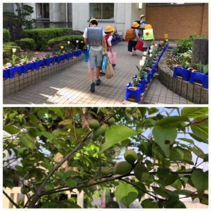正門の右手に植樹されている紅梅に、小さな梅の実が育っています。どれだけ大きくなるのか楽しみです。