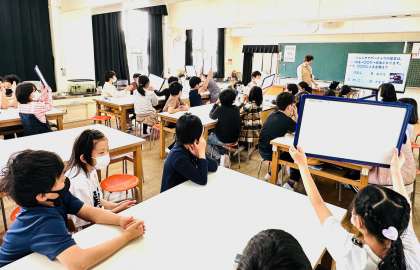 理科の授業の約束を先生と確認した後、4年生までの理科の学習をクイズで楽しくふり返ります。