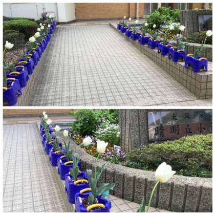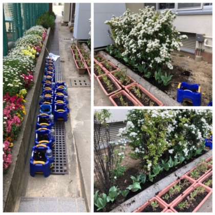 花が終わったチューリップは、来年に向けて校庭の様々な場所に地植えしています。給食室裏のコデマリの下にも植えました。