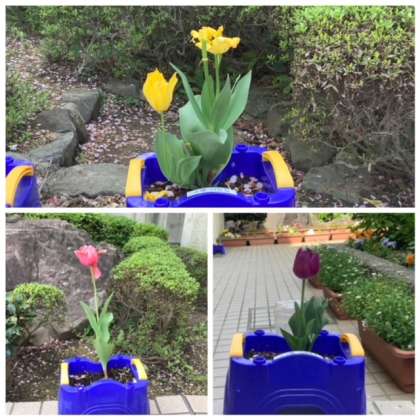 きいろ・あかいろ・むらさきいろのチューリップが枯れてしまう中、最後まで頑張ったプランターを写真に撮りました。よくがんばりました。