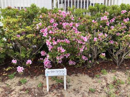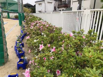 運動場の西〜南側の生垣には、ヒラドツツジとカシワバアジサイが植えられています。
