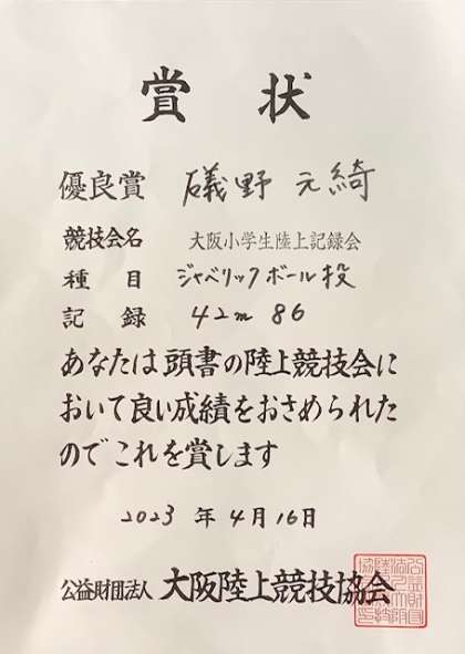 4月16日(日)に開催された大阪小学生記録会において、ジャベリックボール投げで素晴らしい記録で表彰されました。おめでとうございます!