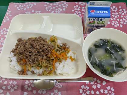 ビビンバは、ごはんの上に野菜とひき肉をのせて混ぜて食べる、人気のこんだてです。年に2回登場し、季節によって使用する野菜が違います。今回はきゅうり、にんじん、切干しだいこんを使っています。