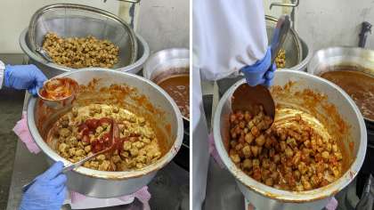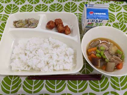 まぐろのオーロラ煮は児童に人気のこんだてです。角切りのまぐろにでんぷんをまぶして揚げ、ケチャップ、赤みそ、砂糖を合わせたたれをからめています。よろしければご家庭でもお試しください。