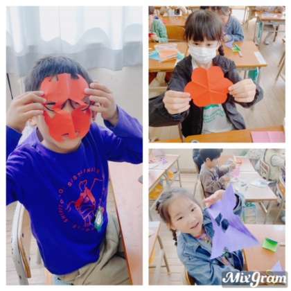 ハサミと折り紙を使い工作をしました。自分だけの形を作りテープに付けて、教室に飾ります。