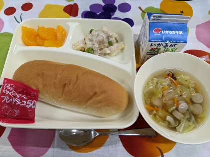 5月2日(火)のこんだては「マカロニグラタン、キャベツのスープ、みかん(缶)、コッペパン、いちごジャム、牛乳」です。