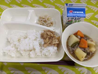 5月8日(月)のこんだては「肉じゃが、もやしのゆずの香あえ、ごまかかいため、ごはん、牛乳」です。