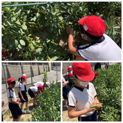 そらまめのさやを観察し、2つ、3つ、4つ・・・中に入っている豆の数を想像しながら、自分の気に入ったさやを収穫しました。