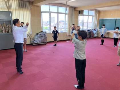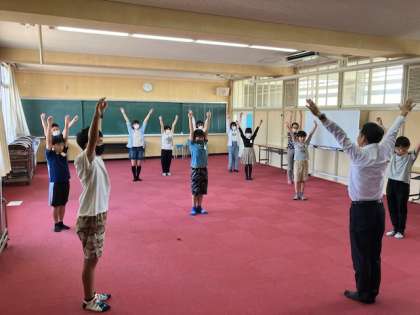 ラジオ体操集会に向けて、昼休み、ラジオ体操練習にはげんでいます。校長先生に動きのコツやお手本としての姿勢を教えてもらいました。ポイントを意識すると、動きがとてもよくなりました。伸ばした腕、とてもきれいにそろっています。