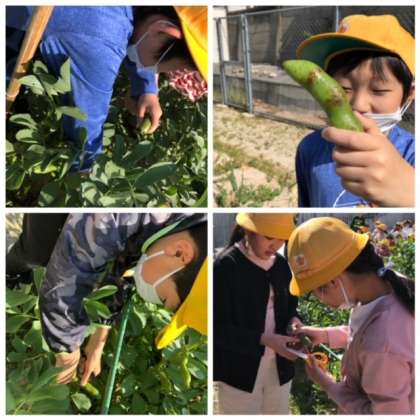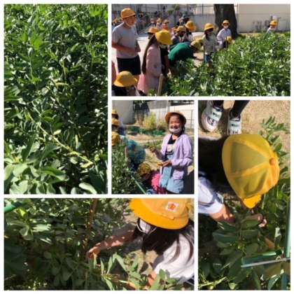 昨日の2組に続いて、今日は朝から1組と3組が「そらまめ」の収穫をしました。