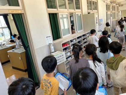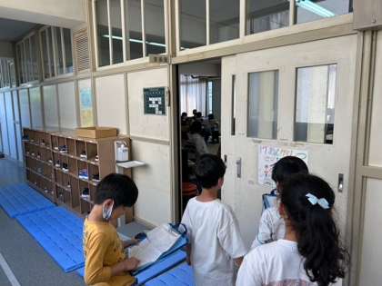 二年生が一年生を学校の中を案内してくれました。19個もある部屋を丁寧に説明していました。一緒に手を繋いで回っていました。