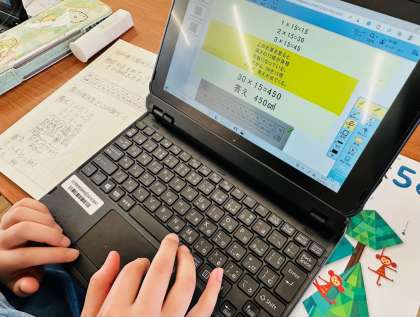 自分のノートに書いた考えをタブレットのカメラで撮影し、タブレット内の発表ノートにまとめています。