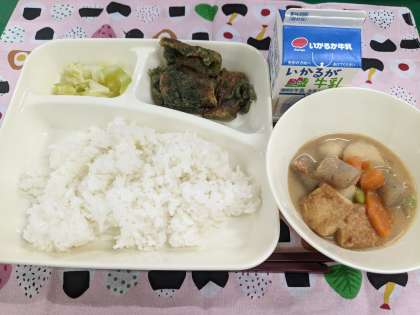 5月18日(木)のこんだては「ちくわのいそべ揚げ、あつあげとさといものみそ煮、あっさりキャベツ、ごはん、牛乳」です。