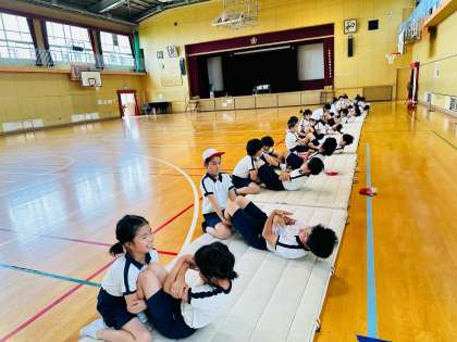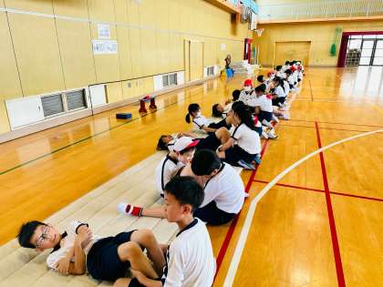 マットの上で、上体起こしと立ち幅跳びに取り組みました。