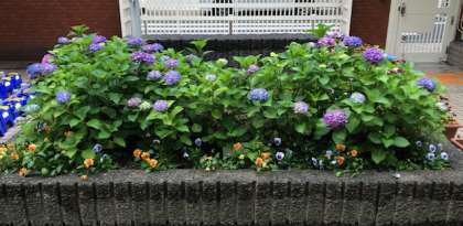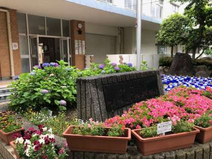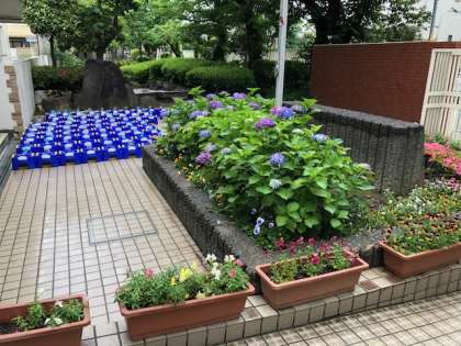 雨上がりの正門の植え込み、あじさいの花がとても美しく咲いています。今年は冬場に肥料を与えたり、しっかりと手入れをしたことで、素晴らしい仕上がりになっています。