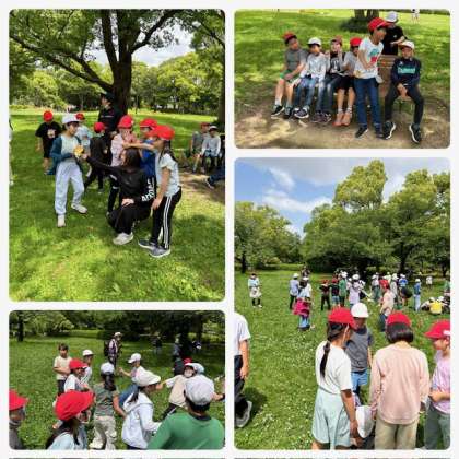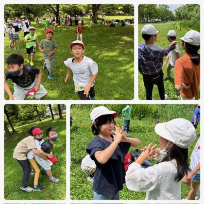 太陽の日差しが暖かく、吹く風が気持ち良く感じられる中、帰校前の自由時間です。子どもたちは、花いちもんめをしたり、散歩したり、あっち向いてホイをしたりとのんびりと楽しんでいます。