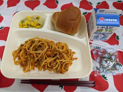 5月23日(火)のこんだては「ミートソーススパゲッティ、レタスとコーンのサラダ、ミニフィッシュ、1/2黒糖パン、牛乳」です。
