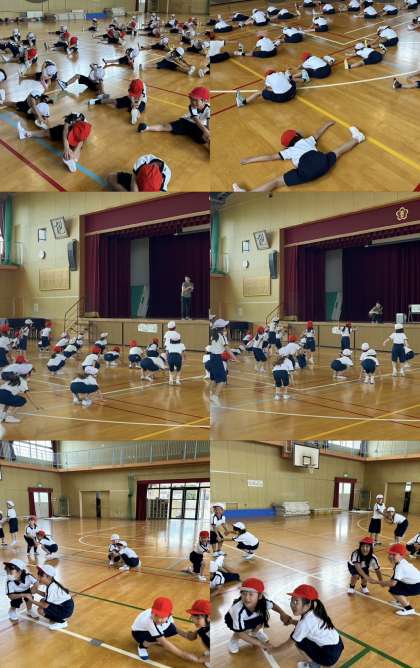 はじめは、柔軟運動です。開脚前屈では、地面にべったりとくっつく子どもたちもたくさんいました!