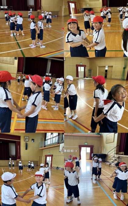 最後は、ペアのお友だちと手をつないだまま笛の合図でひっくり返る運動をしました!少し難しそうでしたが、子どもたちの顔はキラキラ笑顔でした!