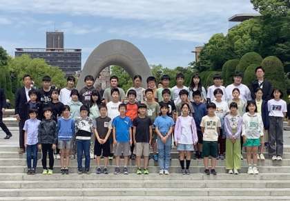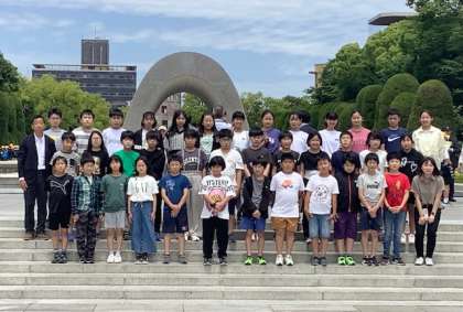 みんなの行動が早く時間に余裕が出来たので、予定にはなかった原爆死没者慰霊碑をバックに学級写真を撮りました。思い出に残るワンショットです。