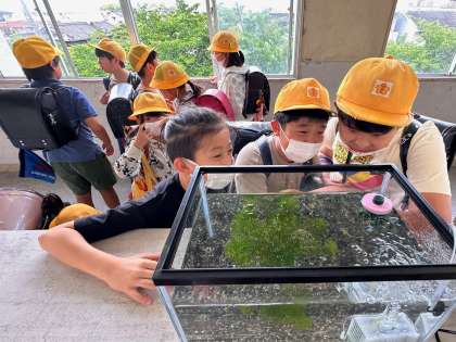 子ども達は、「メダカかわいい!」「ずっと石をツンツンしてる!」「金曜だから、多めにえさをあげとこう。」と、嬉しそうに話しながらメダカのお世話をしていました。