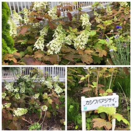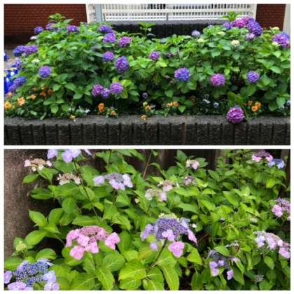 校庭の南側には、カシワバアジサイ。正門には、紫色のアジサイとガクアジサイ。