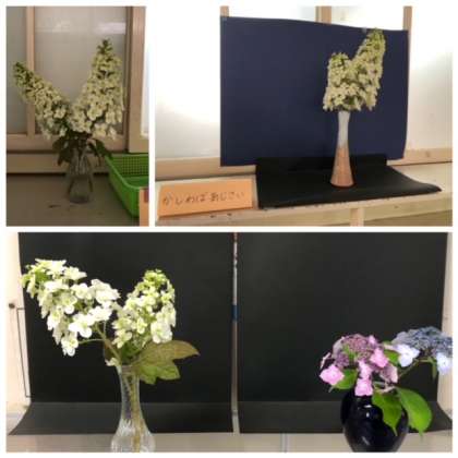カシワバアジサイは、柏の葉のような形の大きな葉とピラミッド形に咲く花が特徴のアジサイの仲間です。保健室・職員室・校内の教室前に切り花として活けています。