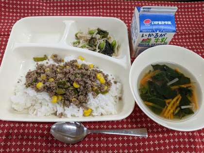 6月1日(木)のこんだては「3色どんぶり、3色スープ、3色酢のもの、牛乳」です。