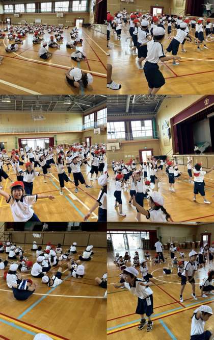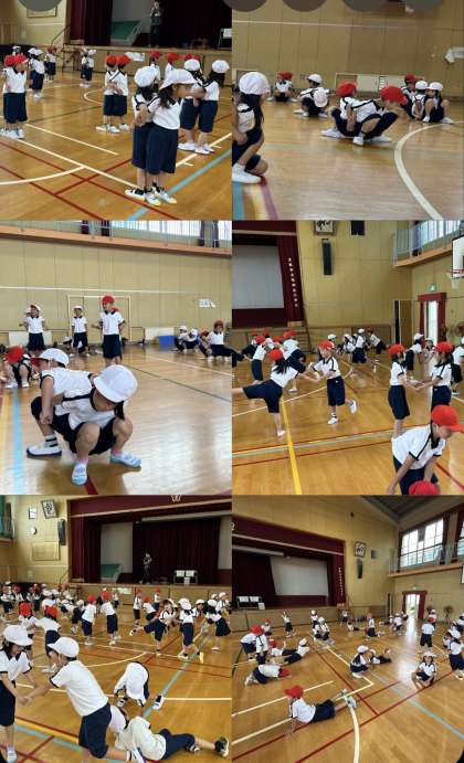 体育では、講堂で全クラスで行いました。一人で行う活動では、柔軟や足裏を揃えたままダルマのようにころがったり、片足立ちからの全身を使ったじゃんけんをしたりしました。ペアで行う活動では、背中を合わせて息を合わせて立ったり座ったり、アザラシになりきってじゃんけんをしたりしました。初めてする運動に子どもたちもテンションが上がっていました!