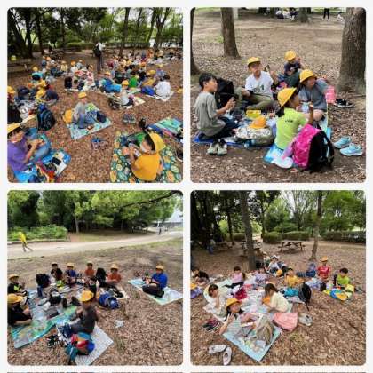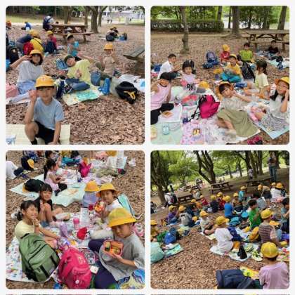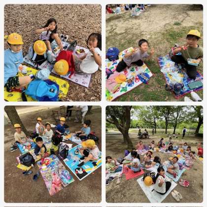 お弁当タイムです。担任の先生からの諸注意をしっかり聞いてから、行動します。お手拭きで手を拭いた後、みんなで手を合わせて「いただきます」をしました。