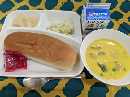 6月6日(火)のこんだては「かぼちゃのクリームシチュー、キャベツのゆずドレッシング、和なし(缶)、コッペパン、いちごジャム、牛乳」です。