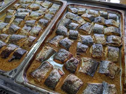 さごしは成長によって呼び名が変わる出世魚のひとつで、体長40〜50cmまでを関西では「さごし」と呼び、70cmを超えると「さわら」と呼ばれます。あっさりとした白身の魚で、今日は料理酒、砂糖、みりん、しょうゆ、ゆず果汁を合わせて下味をつけ、焼いています。
