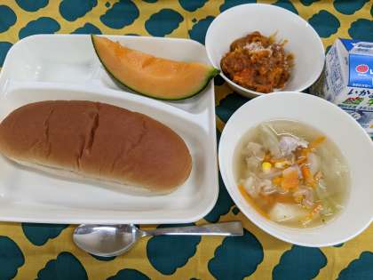 6月9日(金)のこんだては「かぼちゃのミートグラタン、鶏肉と野菜のスープ、クインシーメロン、黒糖パン、牛乳」です。