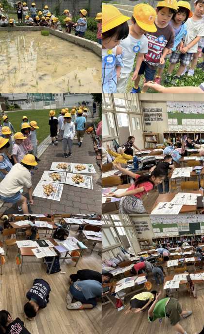 自然観察園に行った際に、前日に5年生が植えた稲を観察しました。みんなが普段食べているごはんのもとの姿に驚き、興味津々でした!また、園芸クラブの方が収穫した野菜や果物なども見せてくれました!
