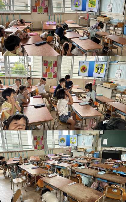 日曜参観の日は、1時間目に防災について学習しました。もしもの時に備えて、今からできることについて考えました。写真は、災害が起きた時にする行動を、動物に例え、まねをしているところです。