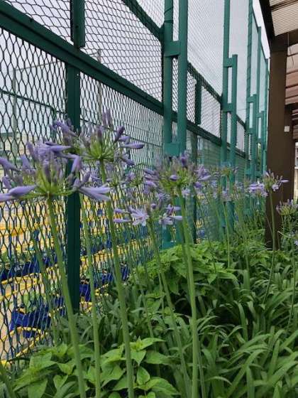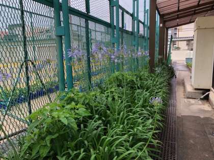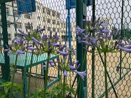 給食室の南側にある花壇に、アガパンサスが植えられています。