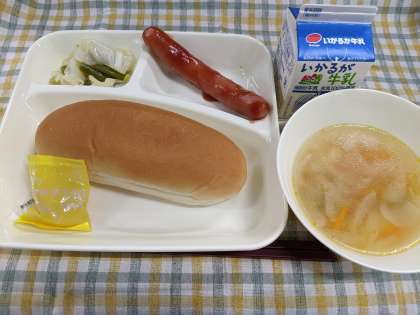 6月16日(金)のこんだては「ウインナーのケチャップソース、スープ、キャベツと三度豆のサラダ、コッペパン、アプリコットジャム、牛乳」です。