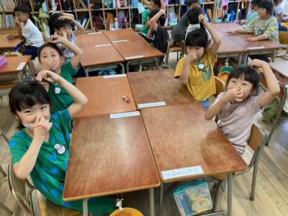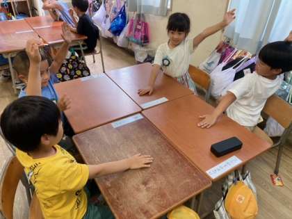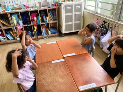 「右手は頭、左手は机」のように伝え、グループでポーズを揃えました。