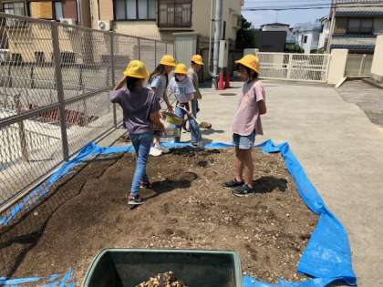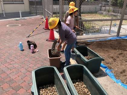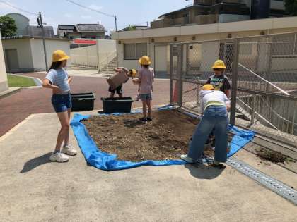 日光消毒をしたプランターの土、ふるいにかけて、赤玉土・軽石を分けながら枯れた根などを取り除きます。