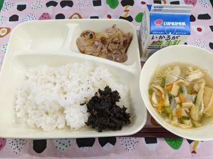 6月19日(月)のこんだては「豚肉の甘辛焼き、五目汁、のりのつくだ煮、ごはん、牛乳」です。