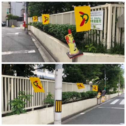 地域はぐくみネットの取り組みで、黄色の「子ども見守り安全旗」がリニューアルされました。車や自転車を運転している人たちに、学校があり安全運転を心がける目印として、とても効果的です。ありがとうございます。