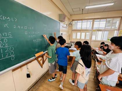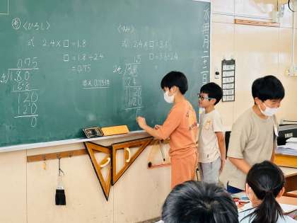 自分のノートに問題を解き終えた児童が、どんどん前に出て黒板に考え方を書いています。