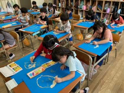 驚いていたり、楽しんでいるようにクレパスで青の画用紙に描いていきます。