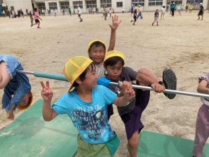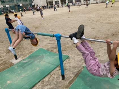 お昼休みは運動場で鉄棒や登り棒をしてます。男の子はみんなが集まると鬼ごっこをして、走り回っています。